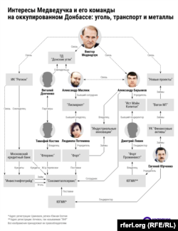Віктор Медведчук – колишній депутат Верховної Ради України і кум російського президента Володимира Путіна – активно включився у переділ власності як у Росії, так і на захоплених територіях України, з’ясував розслідувальний проєкт «Система» (створений спільно телеканалом «Настоящее время» та російською службою Радіо Свобода). Журналісти відстежили інтереси Медведчука у московській нерухомості, сибірській нафті та донецькій металургії. Як люди Медведчука витіснили оточення експрезидента України-втікача Віктора Януковича із торгівлі металом Донбасу на $2 млрд – у частині розслідування «Системи» про переділ Донбасу, який публікує проєкт Радіо Свобода «Донбас.Реалії».